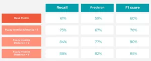 Fuzzy metrics improve significantly as the distance increases. This clearly shows that predictions considered incorrect in exact match are still relatively close to the actual value within the graph hierarchy.