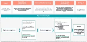 In the Candidate Generation step, the system retrieves potential matches from the Knowledge Graph based on semantic similarity. This might yield a ranked list of candidates such as “disposable gloves” (Rank 1), “work gloves” (Rank 2), …, “gardening gloves” (Rank 9), and “glass handling gloves” (Rank 10), among others.