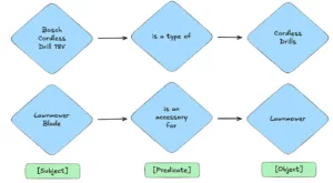 At the heart of this project lies Adeo’s robust Knowledge Graph — a sophisticated graph database housing the company’s taxonomy — which is a structured way of classifying and categorizing information. This network of interconnected data points, currently comprising around 500,000 relations 🔗 with 23,000 unique subjects41 predicates, and 225,000 objects, represents a wealth of information about products, categories, and their relationships. Here are simple examples of relations you might find in this knowledge graph: