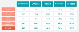 📍 Local Entities: Varied performance. ProductSet (key category) showed a solid balance (Precision: 58.9%, Recall: 61.74%, F1: 60.29%). Color also performed well. HomeSpace needs improvement in precision.