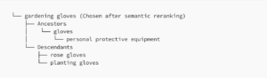 In this step, the system verifies if “gardening gloves” is the most appropriate level of specificity. While it’s a good match in our example, if the context had been broader, simply mentioning the need for hand protection without the gardening context, the hierarchical ranking might promote the ancestor entity “gloves” and link it to the corresponding KG entry.
