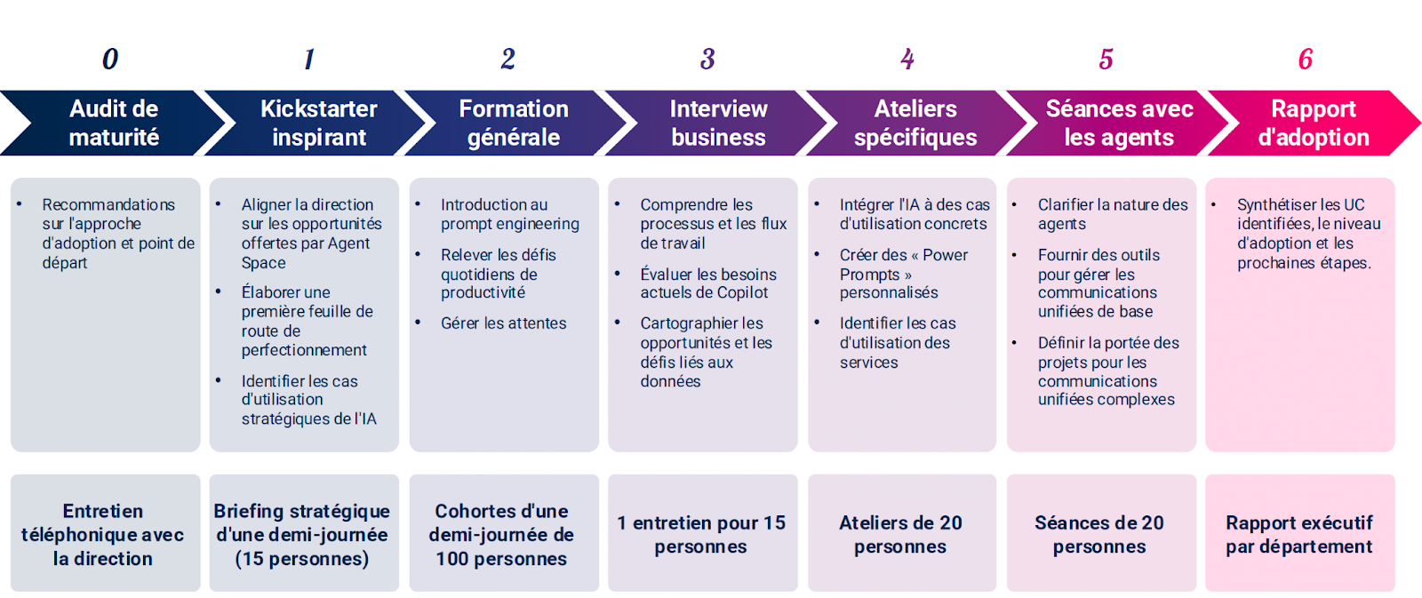 Each phase feeds into the next, culminating in an adoption report that prioritizes investments by department and sets a long-term roadmap.