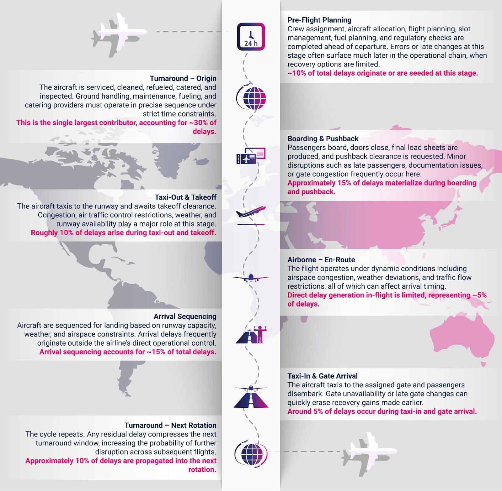 Every flight is a high-dependency sequence of eight stages. A failure in any single “link” creates a “Reactionary Delay” that cascades across the network, often accounting for 46% of total delay minutes globally. Because each stage involves distinct teams (ground handlers, flight deck, Air Traffic Controller, and maintenance), information silos are the primary drivers of inefficiency.